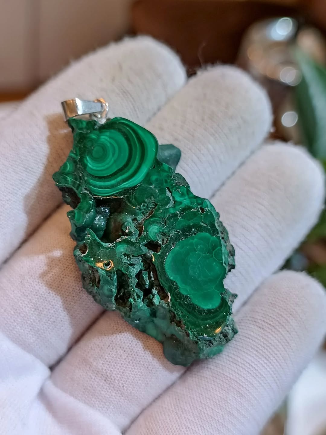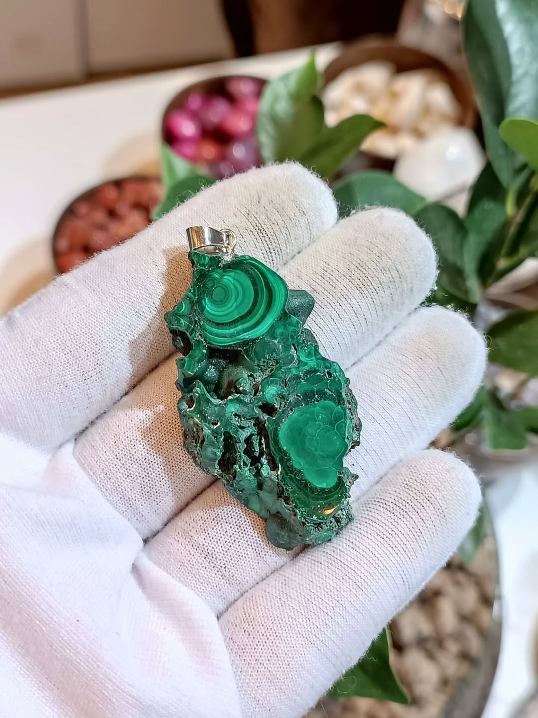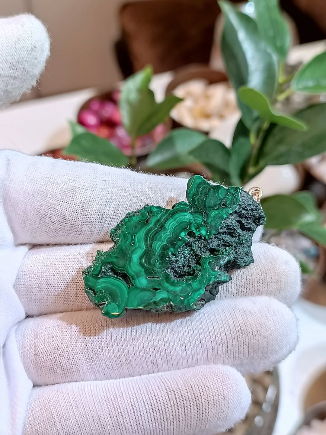 مدال گردنی اسلایس مالاکیت با دو نقش متفاوت در هر طرف