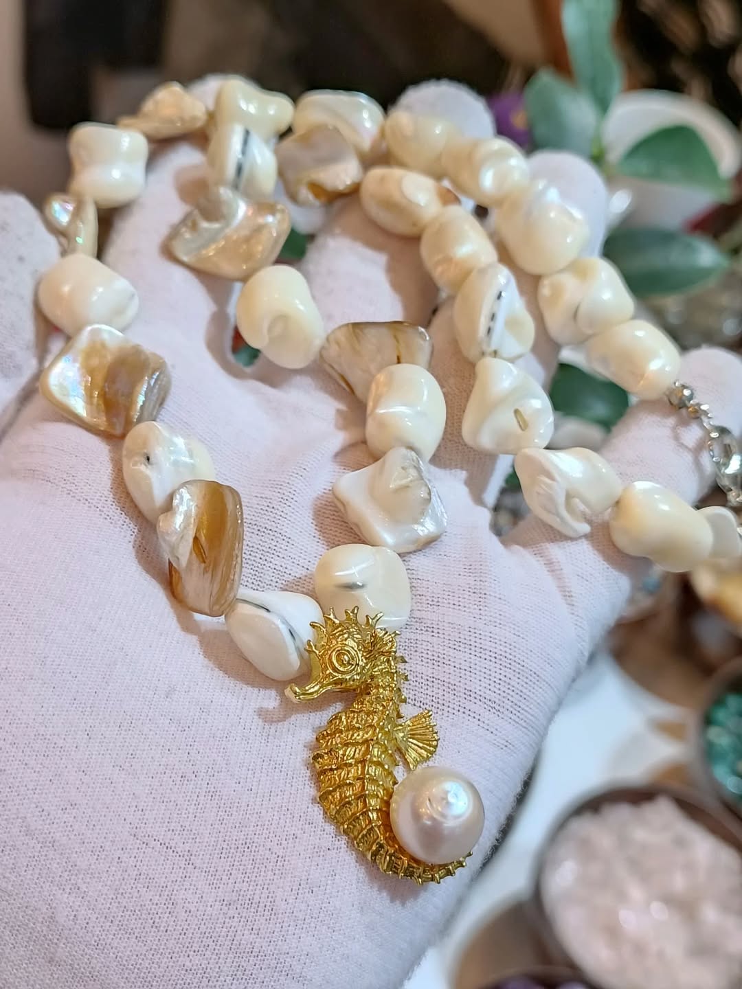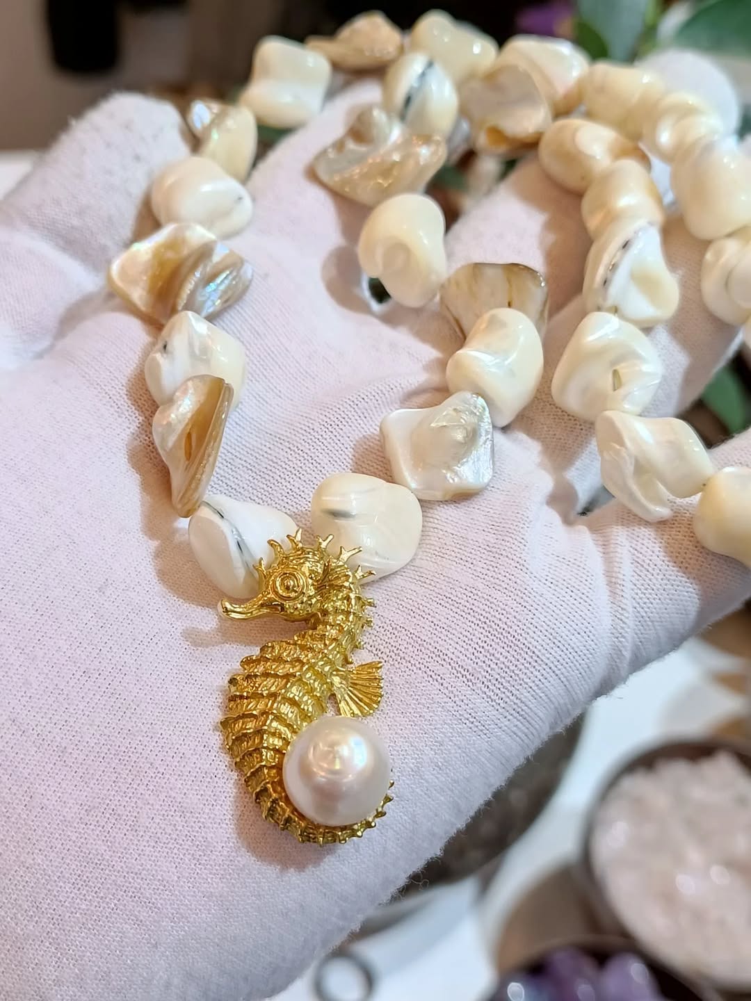 گردنبند زیبا و خاص صدف درشت کاراملی خاص با مدال گردنی اسب دریایی برنج با نگین مروارید آب شیرین فوق العاده عالی